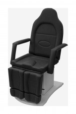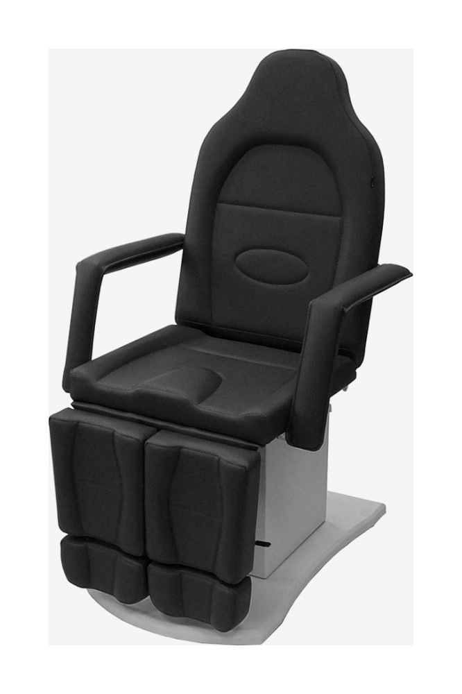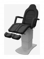 Педикюрное кресло оснащено тремя электромоторами, обеспечивающими регулировку высоты, угла наклона спинки и угла наклона сиденья. Опоры для ног фиксируются при помощи газ-лифтов. Кресло легко раскладывается в горизонтальное положение, образуя ровную поверхность. Надежная конструкция системы подъема обеспечивает высокую устойчивость кресла даже при максимальной высоте. Управляется при помощи ручного проводного пульта. Дополнительно при производстве могут быть установлены различные опции.